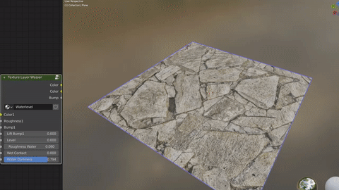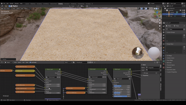 DE: Mit dieser Node-Gruppe kann man 2 Texturen-Sets basierend auf ihrer Height Map verbinden und überblenden. Des Weiteren gibts eine Node-Gruppe mit Wasserlevel obendrein.
