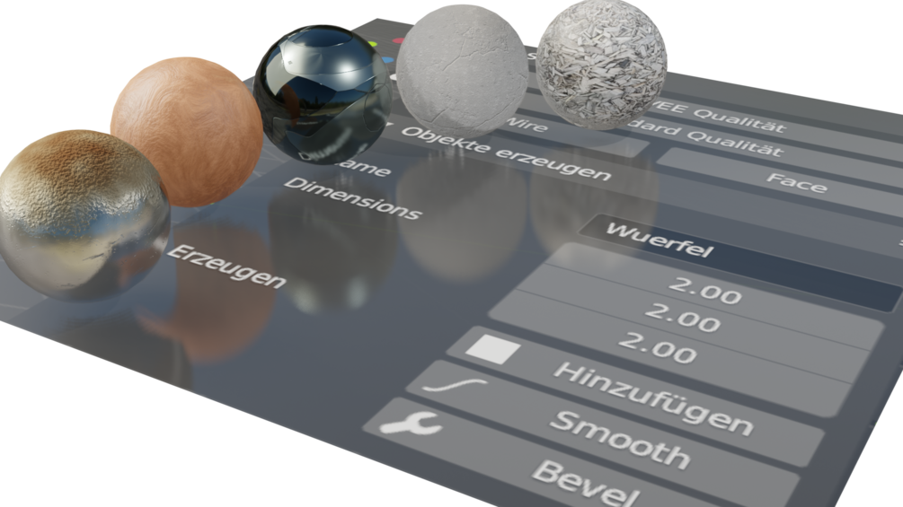 Dieses Addon fügt Cubes mit spezifizierten Dimensionen hinzu und bietet 1-Klick Lösungen für Smooth-Shading, Bevel mit Weighted Normal, Faceorientation, Wire-Modus, HighQuality-Viewport und Standart-Qualität.